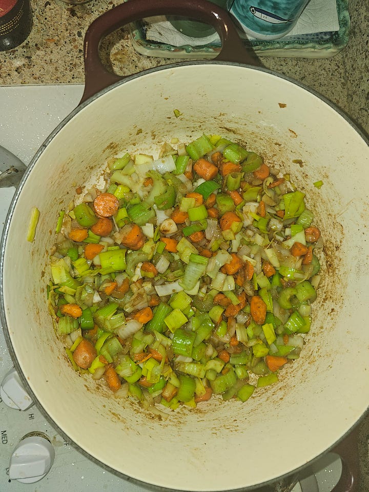 In the meantime, chop up the leeks (white parts only), onion, carrot, celery, and garlic. Rough chop’s fine.