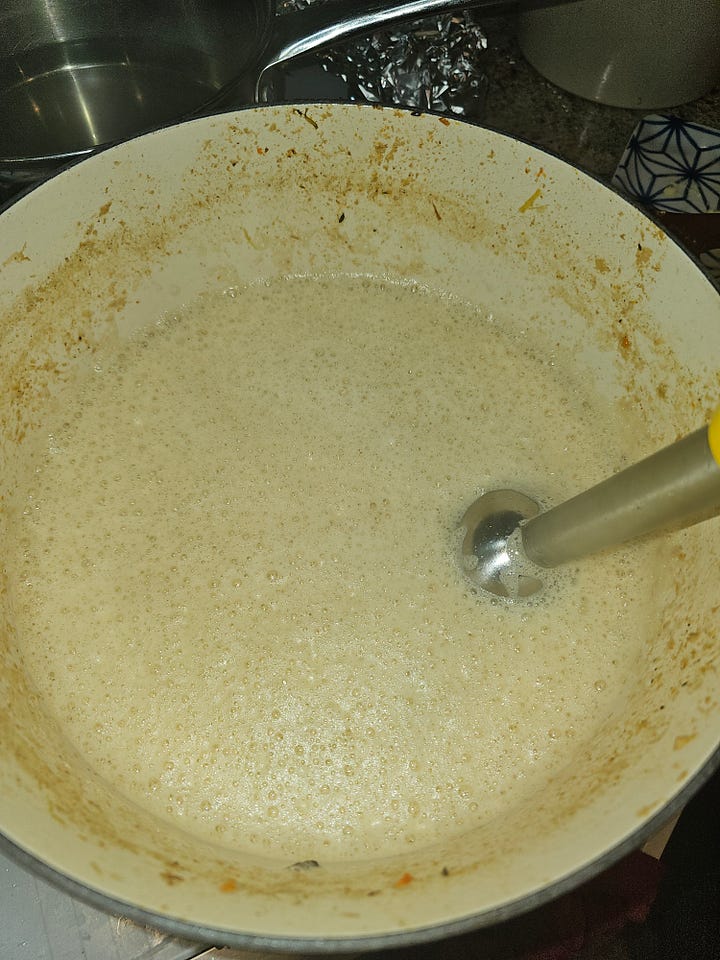 Get your immersion blender, put it into the smaller pot, and blend that goodness so it reforms and you have a lovely jus. It should be good and foamy.
